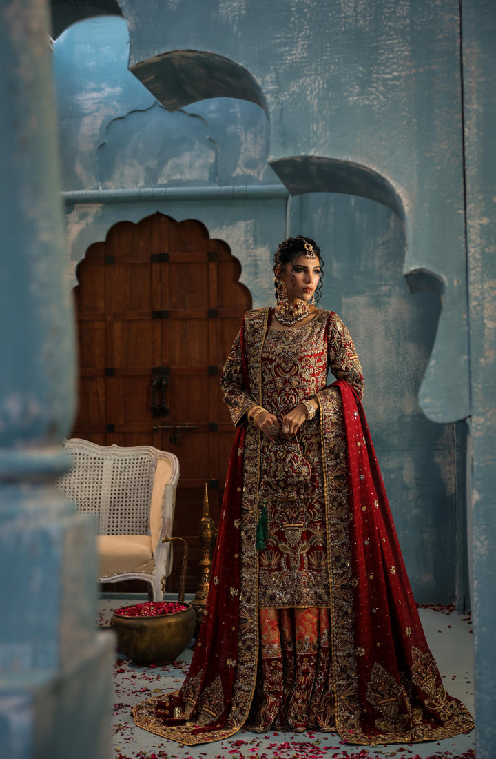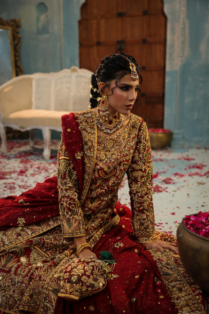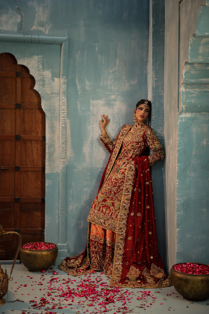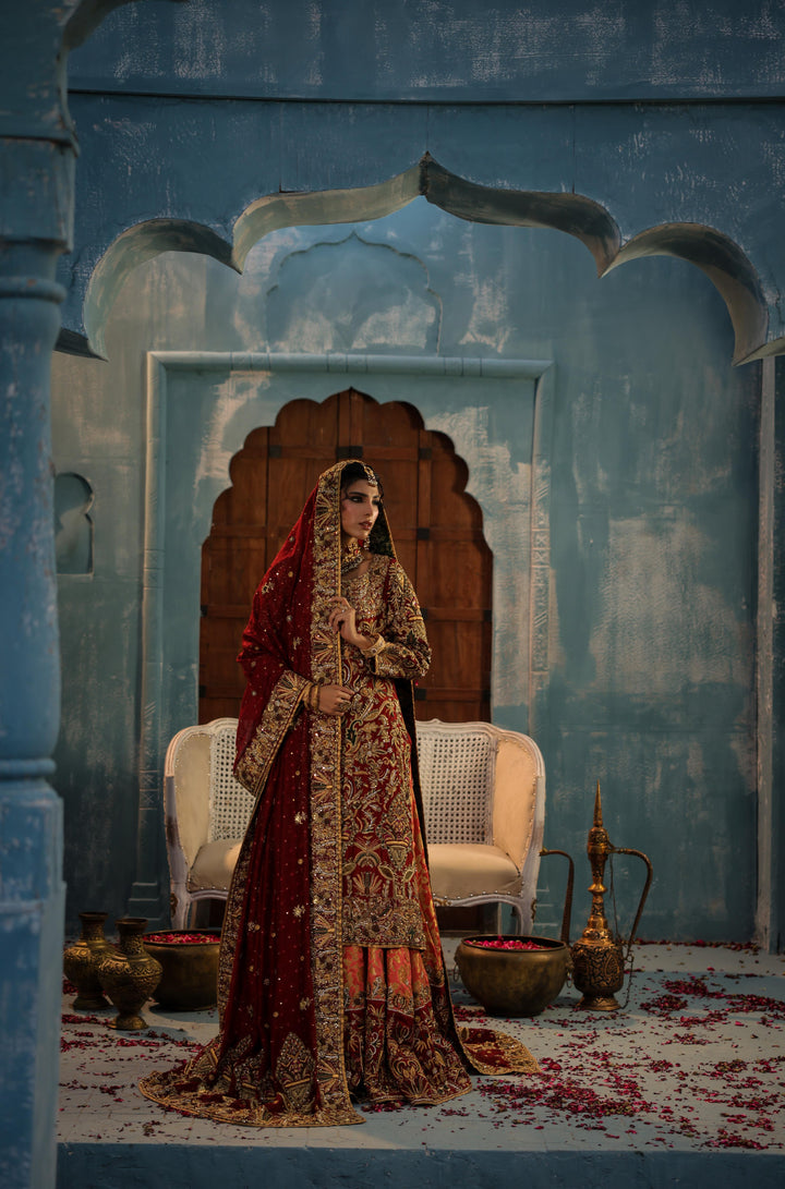 A majestic bridal creation featuring a farshi-train lehenga in rich maroon and melon tones, crafted from kimkhaab, pure silk, and delicate net. The ensemble is adorned with gold, matte gold, and antique silk thread embroidery, forming intricate motifs that exude royal grandeur. Paired with a mid-length shirt richly embellished in traditional craftsmanship, this look perfectly balances opulence and timeless grace — a celebration of heritage woven in gold and silk.