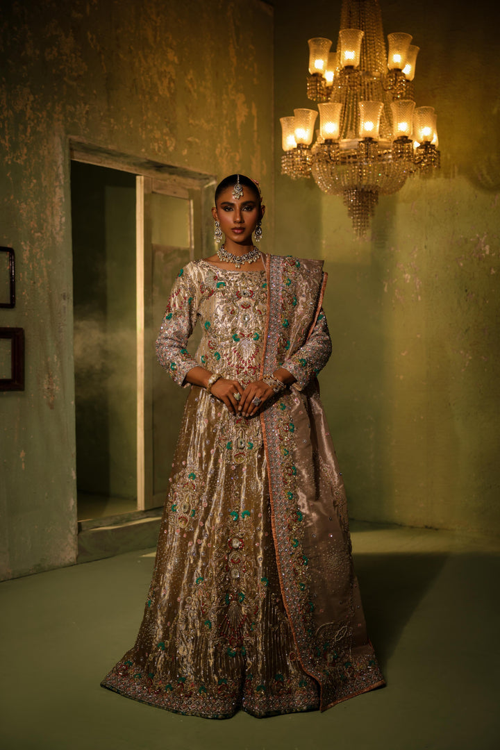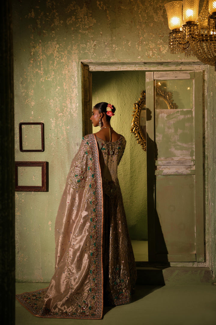 Draped with unparalleled finesse, the rose gold tissue dupatta unfurls like a golden dawn, its delicate fringe adorned with matching embroidery that dances with every movement. This ensemble, a harmonious blend of traditional craftsmanship and contemporary allure, is a testament to the artistry of haute couture, destined to crown any bride with an aura of majestic splendor.