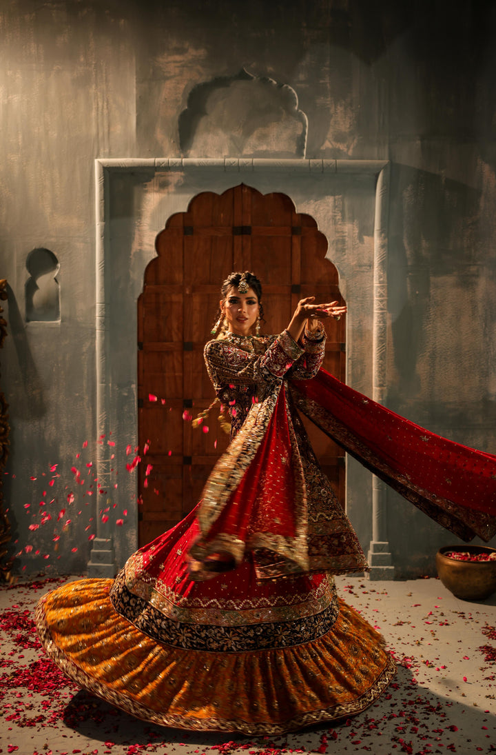 The look is completed with a silk net dupatta in blood red colour , exuding royal luxury and tradition a custom bridal couture Pakistan creation that beautifully merges a modern yet traditional silhouette with centuries-old artistry