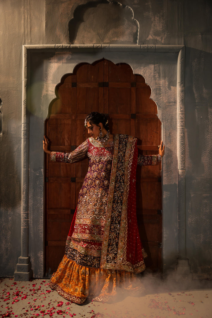 An opulent expression of heritage-inspired bridal fashion, this ensemble features a deep purple fully hand embroidered atlas long straight shirt paired with a red and mustard rust farshi heavy lehenga a masterpiece of heirloom bridal couture.