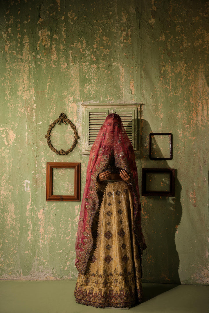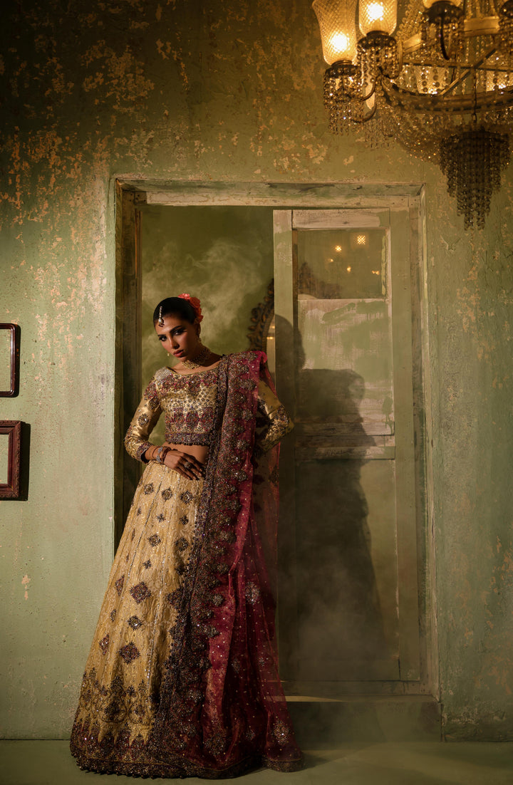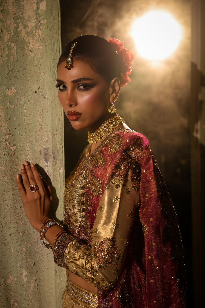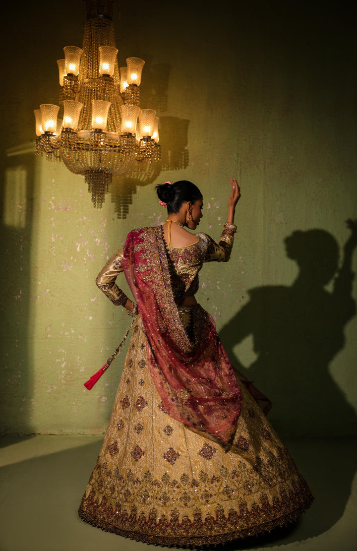 The lehenga, a resplendent masterpiece of jacquard fabric, flows in voluminous elegance, adorned with the same luxurious detailing that elevates its antique gold finish to a divine glow. Draped gracefully is the dupatta, a delicate veil of magenta pink zar tissue net, its ethereal texture enriched with hand-stitched stones and intricate embroidery, cascading with a royal flourish. This ensemble, a celebration of handmade artistry, embodies a majestic aesthetic destined to grace the bride with unparalleled sophistication.